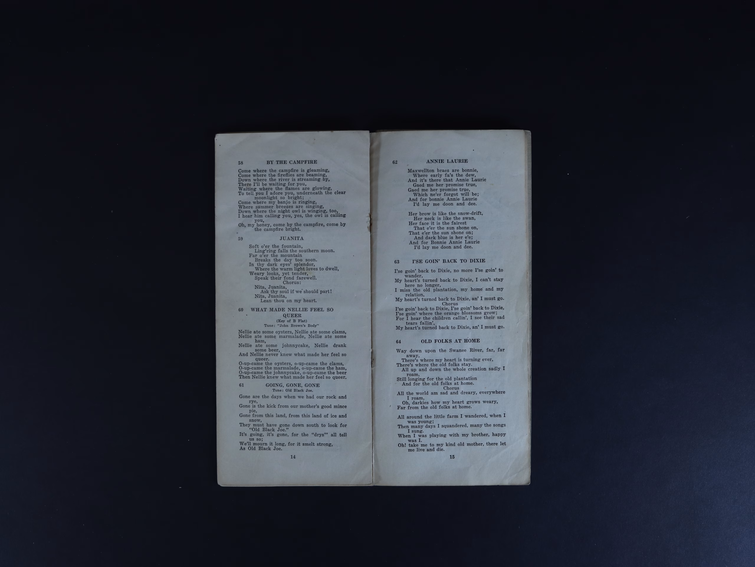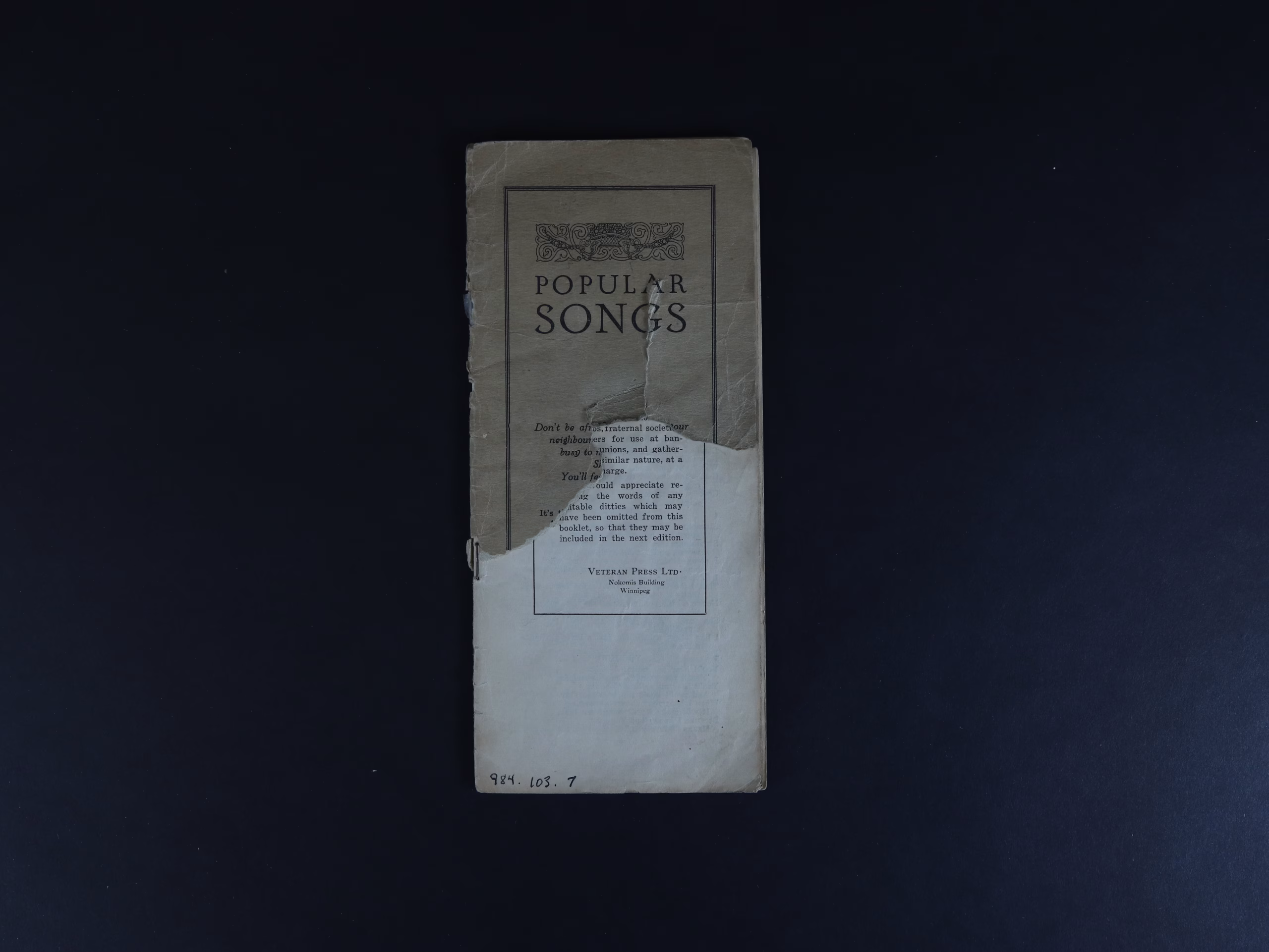 This is a collection of songs from post-WW1. The songs are ones that soldiers would sing to entertain themselves. It was to be supplied to ". . . . regimental associations, soldier's clubs, fraternal societies and others for use at banquets, re-unions, and gatherings of similar nature, at a nominal charge." printed on inside page. "POPULAR / SONGS" is printed at the top of the front cover other text is missing with the bottom half of the front cover.