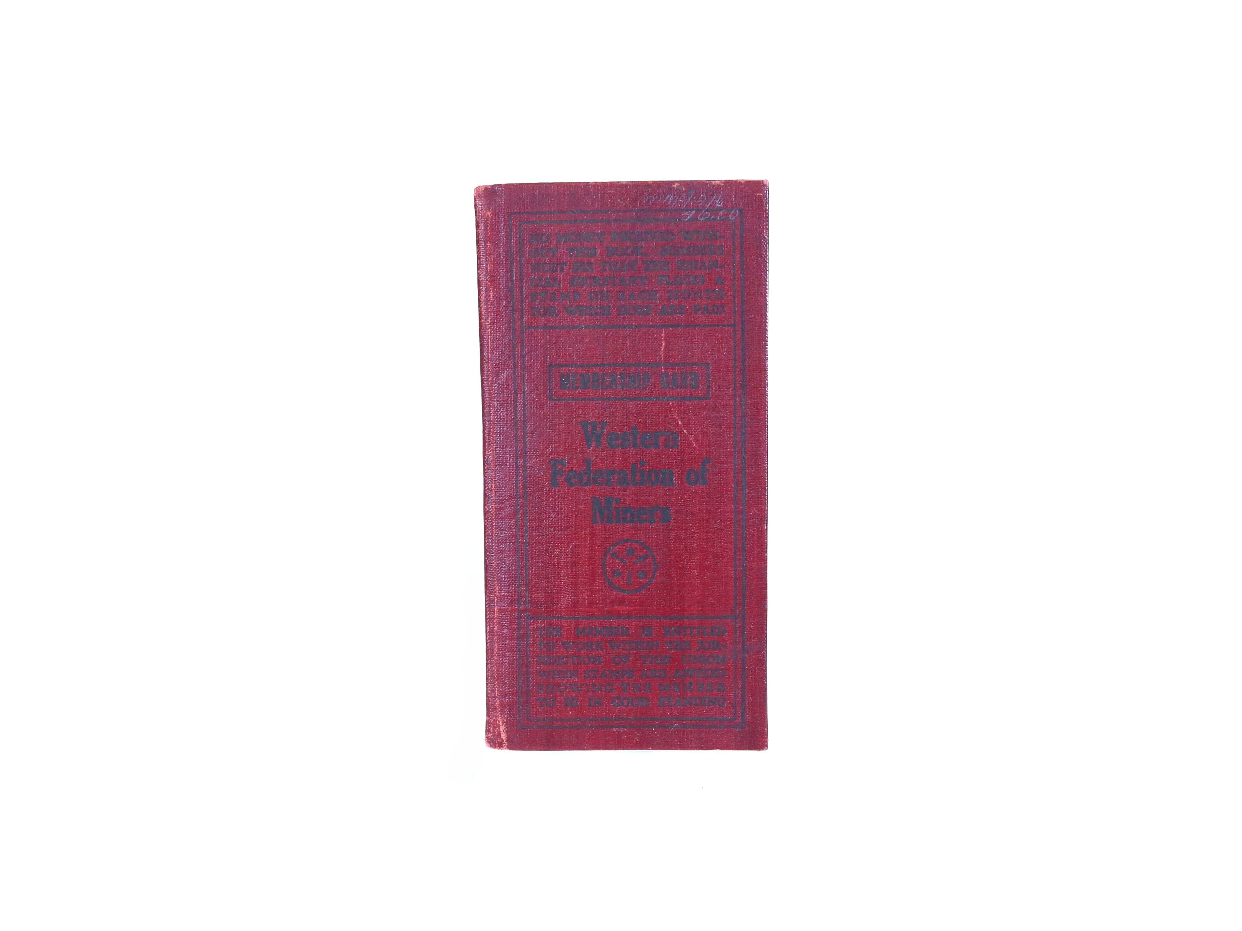 Western Federation of Miners membership card and booklet, red with green/black lettering. The book was used to put due stamps and assessment stamps in, for the relief of members locked out by mining companies.